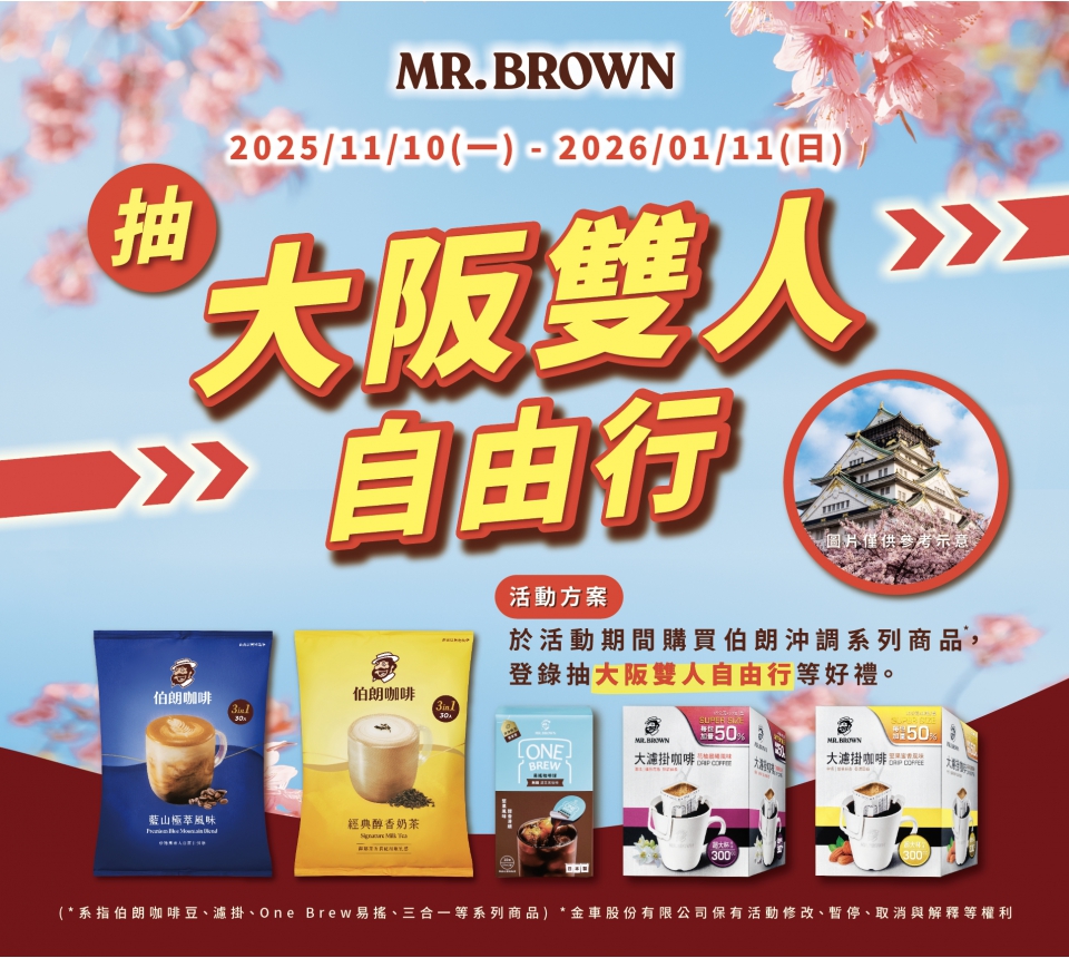 活動期間購買伯朗沖調系列指定商品,即可登錄發票抽大阪雙人5天4夜自由行等好禮,每筆發票限登錄一次,重複登錄將不予計算。
